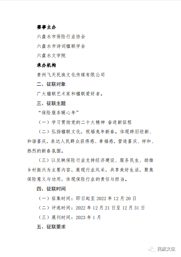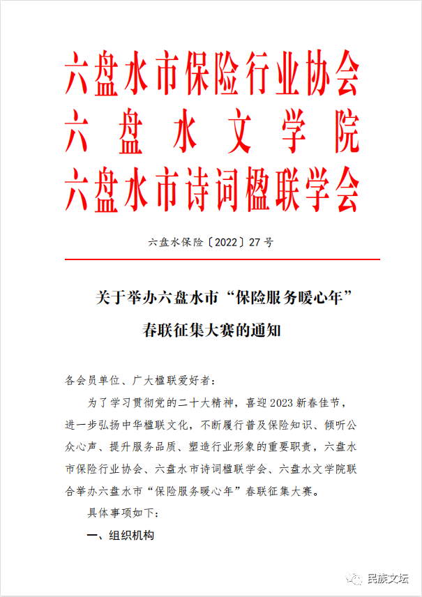 为了学习贯彻党的二十大精神,喜迎2023新春佳节,进一步弘扬中华楹联文化,不断履行普及保险知识、倾听公众心声、提升服务品质、塑造行业形象的重要职责,六盘水市保险行业协会、六盘水市诗词楹联学会、六盘水文学院联合举办六盘水市“保险服务暖心年”春联征集大赛。具体事项如下: