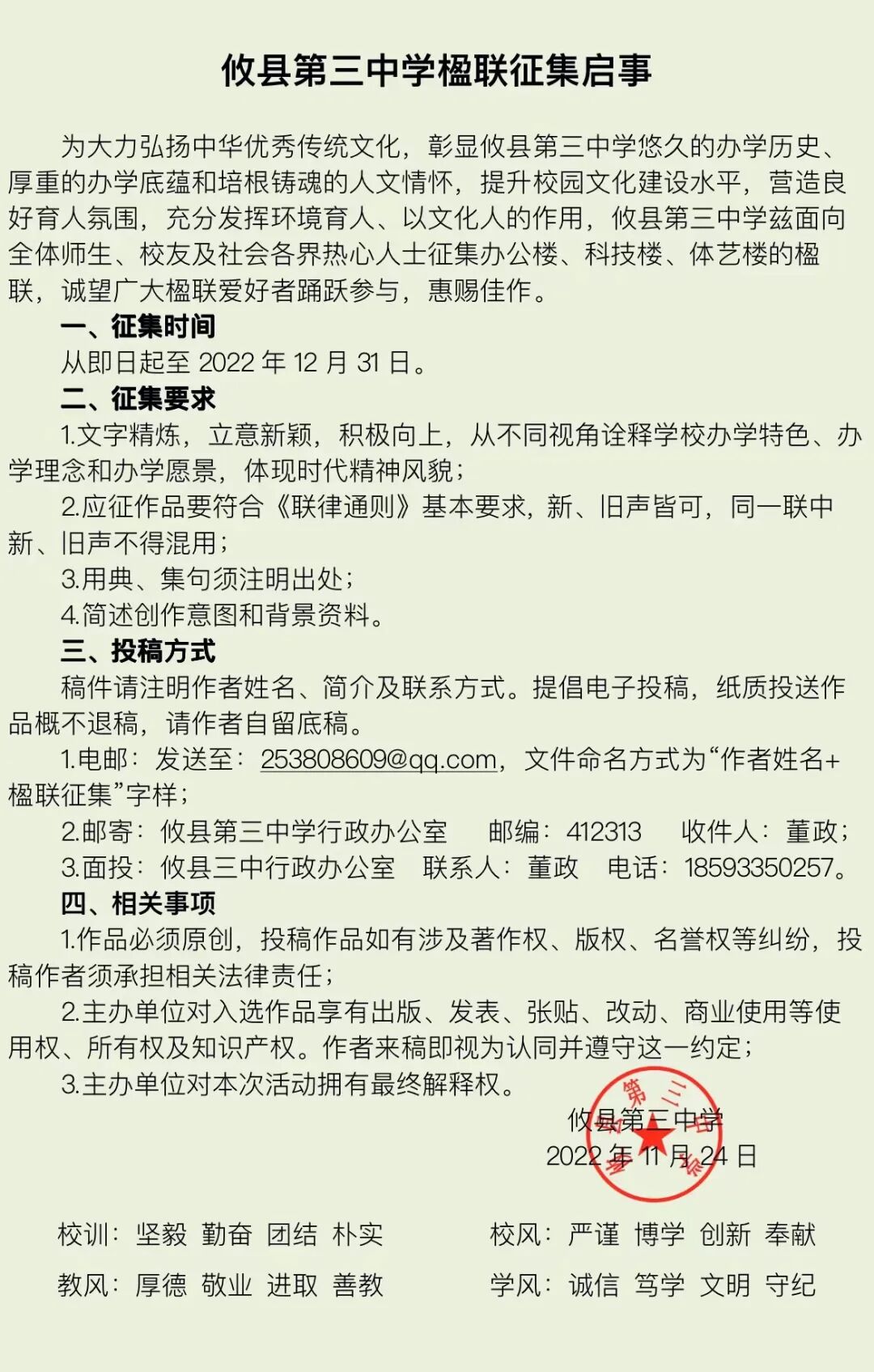 [其它征稿] 【22.12.31】攸县第三中学楹联征集启事