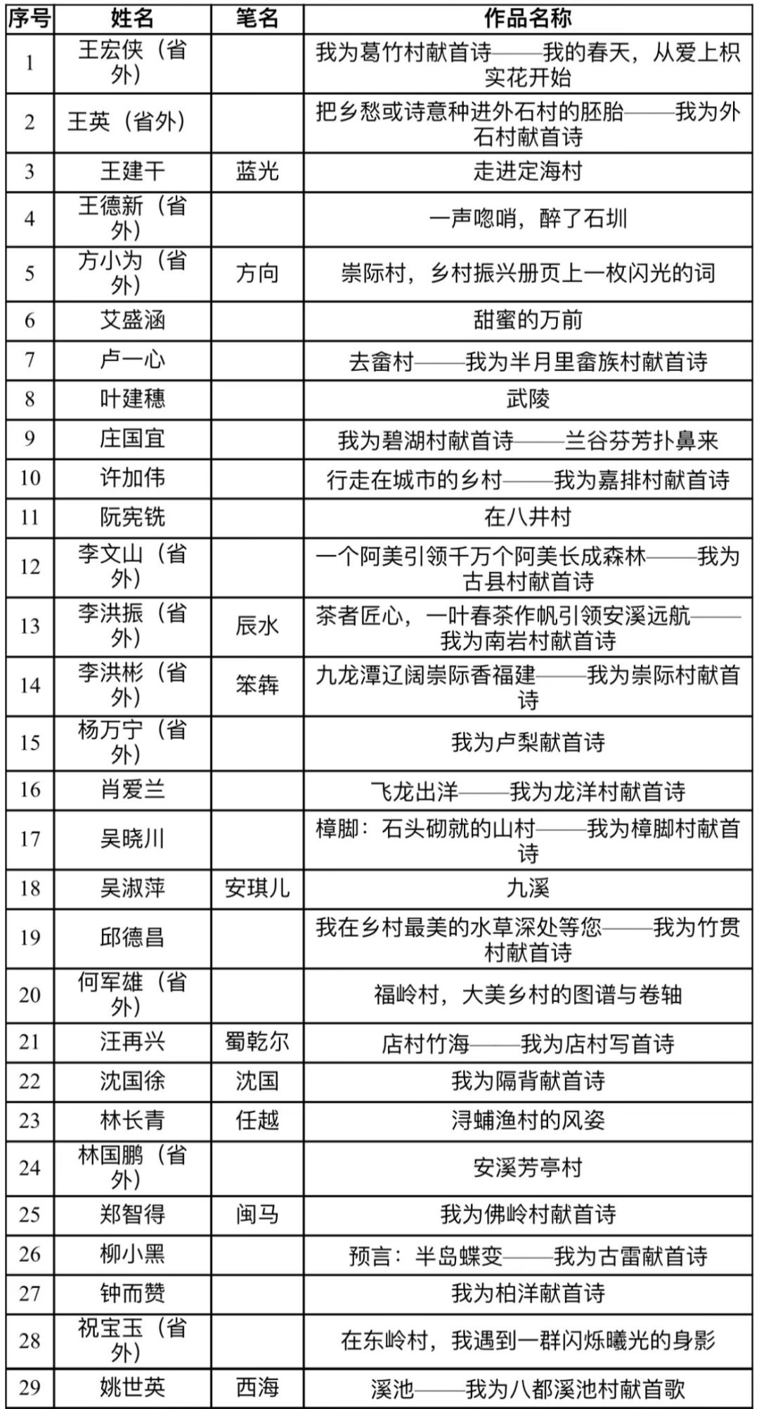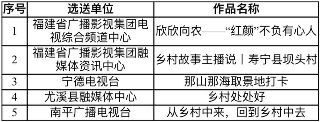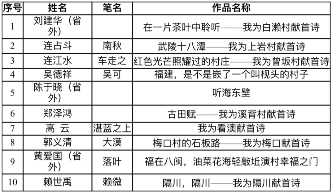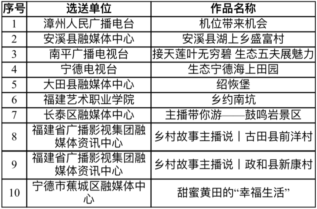 为进一步宣传展示在习近平新时代中国特色社会主义思想指引下福建省乡村振兴的新气象新风貌新成效,服务“三农”,造福群众,在福建省乡村振兴局的指导下,由福建省文学艺术界联合会、福建省广播影视集团、福建省乡村振兴研究会主办,福建省作家协会、福建省电视艺术家协会、福建省广播影视集团科技文体传媒中心承办的“主播说乡村”优秀短视频和“我为乡村献首诗”诗歌征集展播活动,经主办方组织专家初评、终评,最终评选出优秀短视频佳作奖5名,提名奖10名,优秀诗歌佳作奖3名,提名奖10名,入围奖40名。为充分体现公开、公平、公正的原则,现将评选结果公示如下: