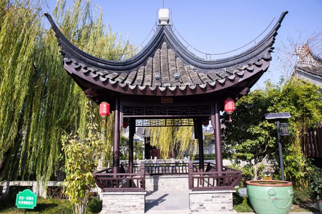 古镇无限景,一亭收眼底。海春轩塔旁的古亭,古风遗韵,优雅天成。站在亭中,仰望建于唐代屹立千年不倒的海春轩塔,一亭一景一醉人,感受古镇的深厚文化底蕴。
